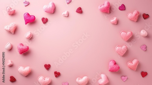 Hearts and frame on a soft pink backdrop. Concept for Valentine's or Women's Day.