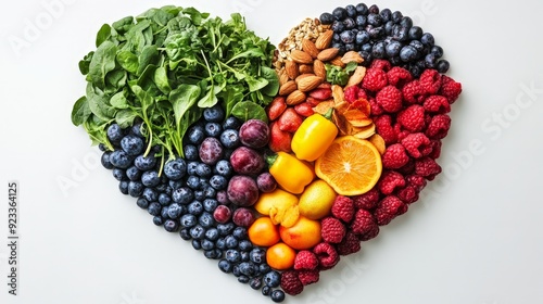 Heart-shaped arrangement of healthy foods, colorful fruits, and leafy greens