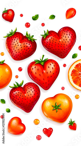 Heart-shaped strawberries, watermelons, and oranges on a white background. Fresh, juicy, vibrant design ideal for Valentine’s Day, love themes, and creative projects