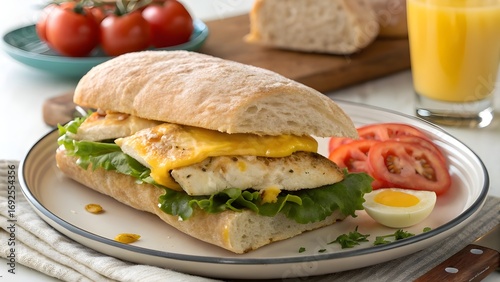 Hearty Classic Chicken And Cheese Breakfast Ciabatta Layered With Fluffy Egg And Melted Cheddar, Rustic Golden Bread Perfect For Morning Energy, Brunch Plate, Or Cafe Favorite