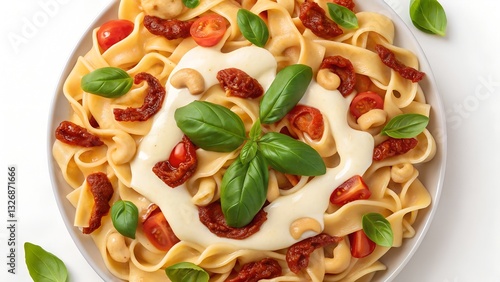 Hearty plant based pasta with sun dried tomatoes Delicious pasta dish with sun-dried tomatoes and fresh basil.