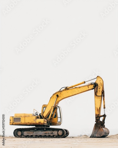Heavy Machinery at Rest: A solitary yellow excavator stands idle, its mechanical arm extended in a minimalist scene, a testament to the power of modern machinery.