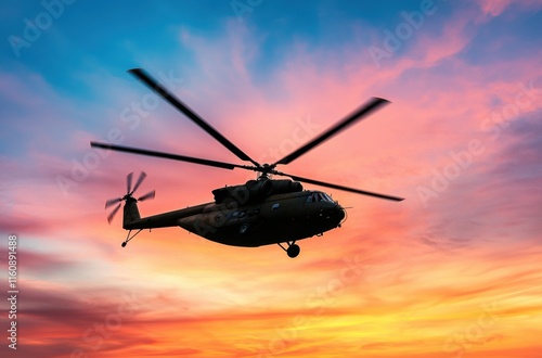 Helicopter Flying Against Colorful Sunset Sky at Dusk