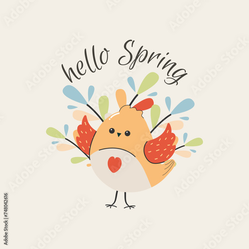 Hello spring. Square postcard, sticker, poster, print, patch. Positive spring vector illustration with a singing bird and beautiful flowers, eps10
