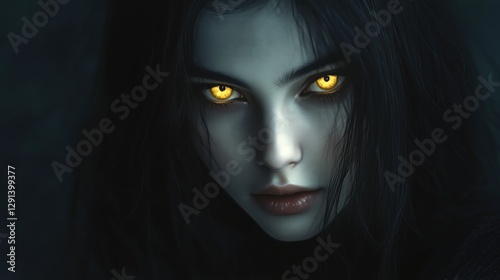 Her piercing yellow eyes glow through the darkness, framed by cascading black hair, as she slowly emerges from the shadows.