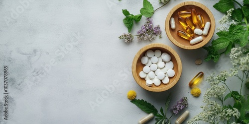 Herbal supplements, vitamins, and capsules in wooden bowls with fresh leaves.