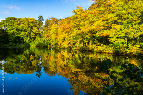 autumn, water, see, forest, nature, flux, countryside, tree, heaven, fall, yellow, park, green, blue, leaf, leaf, season, duck pond, orange, pretty, reflex, effect, colouring, colours, shiny, stroll, stillness, relax