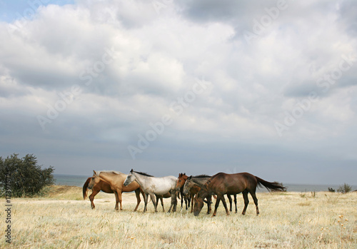horse, beach, sea, horizon, tail, sand, summer, blue, seascape, scene, water, coastline, nature, moody, park, fast horse, line, farm, people, cloud, over, outdoors, rural, scenic, wild, tranquil, coast, sky, animal, crimea, ukraine, image, horizontal, day, autumn, group, cloudscape, herd