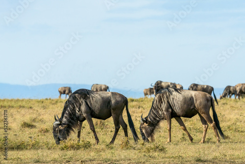 herd of wildebeest standing and eating grass together in savanna grassland at Masai Mara National Reserve Kenya