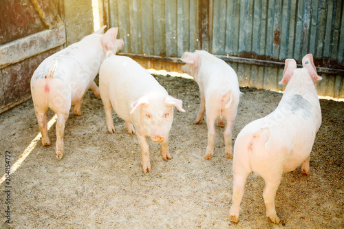 Herd of young piglet on hay and straw at pig breeding farm. Agriculture and livestock production.