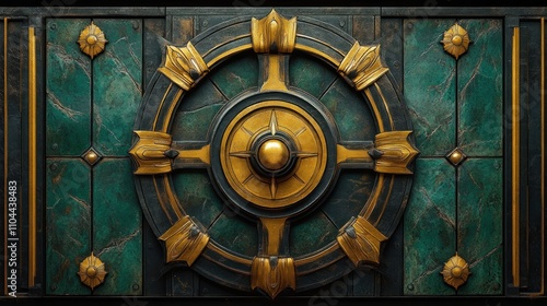metal, gold, green, panel, ornate, decorative, design, texture, background, art deco, antique, vintage, wheel, circular, symmetric, geometric, elegant, luxury, rich, detailed, craftsmanship, surface, pattern, frame, border, emblem, symbol, style, abstract, architecture, industrial, ancient, classic, historical, majestic, regal, royals, intricate, embossed, engraved, stone, marble, dark, brass, bronze
