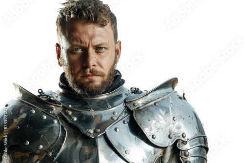 Heroic knight with a determined gaze in shining armor, isolated on white