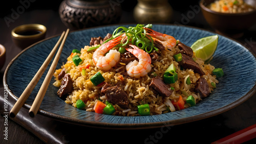 Hibachi fried rice with shrimp and beef, served on a colorful plate. The dish is garnished with scallions and chili peppers, adding a vibrant touch. Perfect for Asian cuisine menus