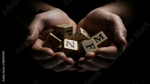 Hidden messages: hands cradle letter blocks forming a cryptic word, symbolizing mystery, interpretation, and discovery