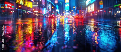 Higefinition background of a vibrant city street in the rain, with reflections and colorful lights, suitable for urban and dramatic themes