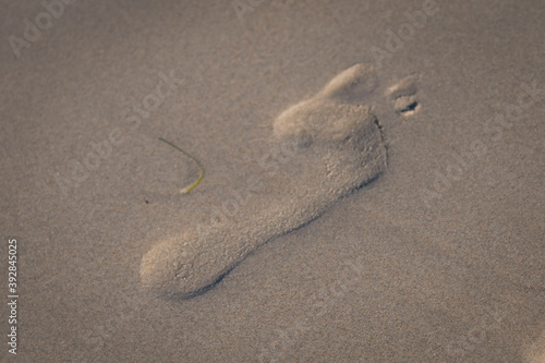 High angle shot of a person's footprint on a wet sandy ground