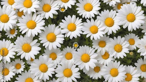 High angle vector illustration of a dense cluster of white daisies with bright yellow centers, white flowers background