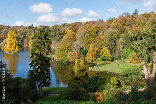 High angle view of the autumn colours at Stourhead Gardens