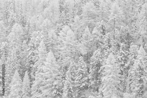 High mountain larch forest covered with fresh snow creates a black and white effect