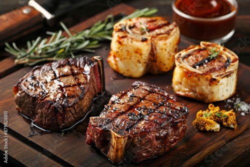 High quality angus beef steaks cooked on wood fired grill