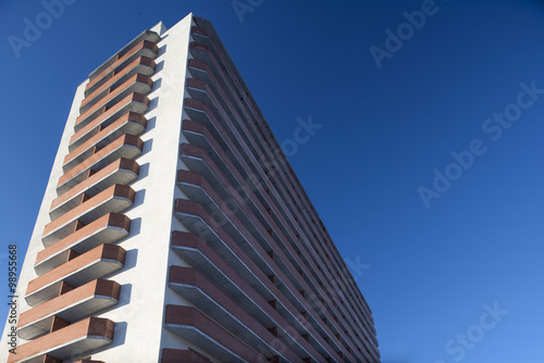 high residential building on a background of blue sky with tilt-shift effect