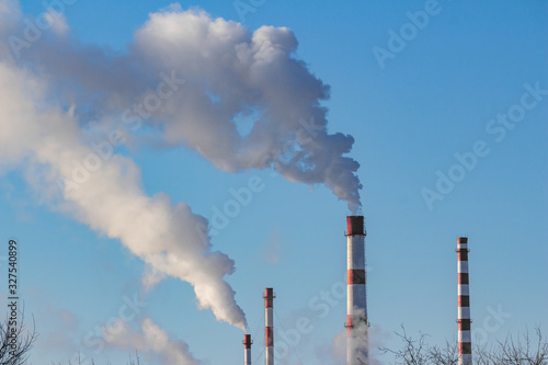 pipe, plant, technology, environment, industry, white, steam, smoke, high, pipe, red, cogeneration plant, factory, ecology, emission, blue, sky, thick, industrial, city, civilisation, day, nobody