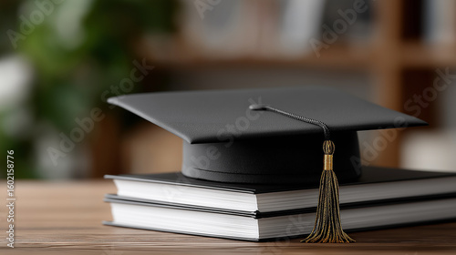 High-angle tabletop view of stacked academic books with detailed textures and classic black graduation cap with golden tassel, representing scholarly achievement and graduation celebration.