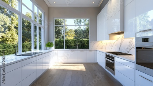 white, kitchen, corner, window, premium, oak, engineered, flooring, custom, cabinet, pure, carrara, marble, countertop, integrated, appliance, door, architectural, spotlight, dramatic, side, view, composition, surface, professional, visualisation, interior, design, render