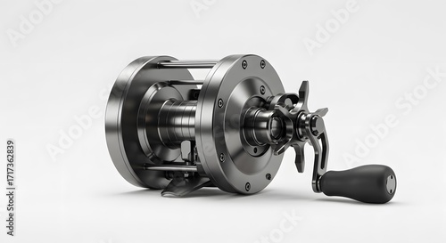 tackle, gear, angling, sportfishing, metal, aluminium, stainless steel, silver, grey, metallic, polished, shiny, industrial, robust, hard-wearing, precision, mechanism, technology, engineering, studio shot, white background, isolated, closeup, detail, high-quality, professional, clean, hobby, leisure, adventure, recreation, performance, accurateness, tool, accessory, fishing gear