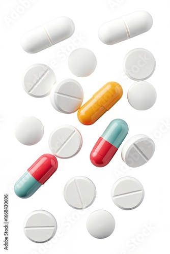 High-quality realistic photograph of white and colored pills and capsules falling in mid-air with soft shadows and high contrast lighting on transparent background