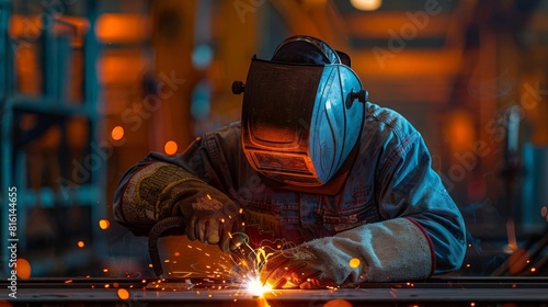 Highresolution image capturing the dynamic and gritty atmosphere of an industrial welder at work, with a focus on glowing metal and protective gear