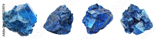 High-resolution image of four blue crystals with intricate textures and details, perfect for use in geology, mineralogy, and natural science projects.