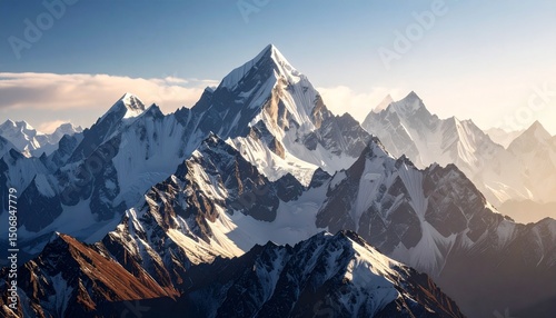 High-resolution image of majestic mountains with snow-covered peaks, wide scenic view, elegant composition
