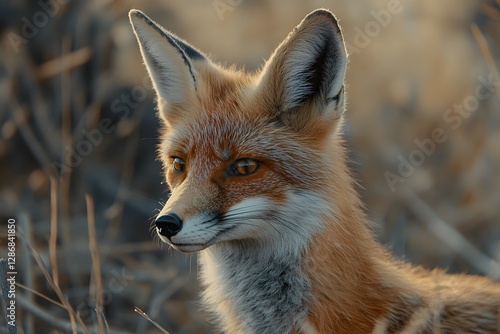 fox, red fox, wildlife, animal portrait, closeup, golden hour, autumn color, soft focus, depth of field, warm tones, wilderness, sunlight, golden light, copy space