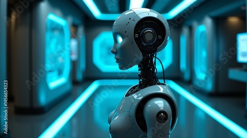 High-resolution stock photo of a sleek, silver Humanoid robot with glowing blue LED eyes, surrounded by holographic screens and neon lights in a futuristic laboratory or industrial environment