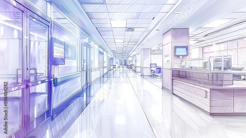 High-tech hospital interior design this image showcases a modern hospital corridor with a bright, clean design. The sterile environment emphasizes professionalism and advanced healthcare technology.