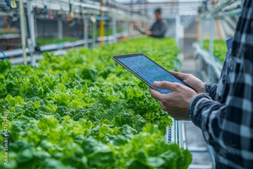 High-tech hydroponic farm with automated climate control systems. Farmer monitoring data on a tablet, Generative AI