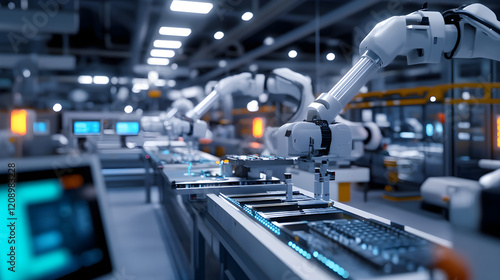 High-Tech Industrial Machine with Robotic Arms in Automated Manufacturing Assembly Line