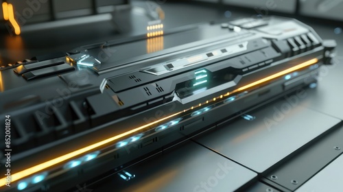 High-tech workstation setup with an integrated electric accumulator and glowing indicators. Electric accumulator