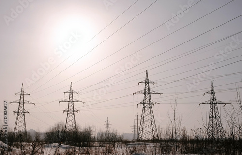 high voltage, tower, cable, current, danger, electric, electrical, electricity, energetic, energy, engineering, environment, equipment, generator, grid, high, industrial, industry, infrastructure, line, mast, metal, network, plant, pole, power, sky, station, steel, technology, transformer, transmission, transmission line, transmit, volt, voltage, watt, wire, construction, distribution, dusk, generation, tall, city, winter, tree