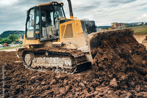 highway construction site with mini bulldozer pushing earth and leveling ground