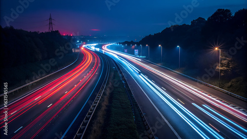 highway, traffic, light, night, long exposure, streak, blue, red, motion, blur, speed, movement, illumination, road, transportation, journey, evening, darkness, city landscape, urban, abstract, light painting, commute