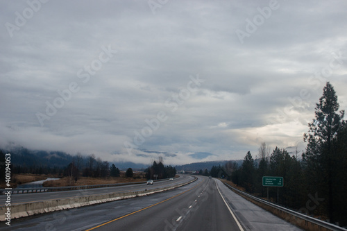 Highway with road signs on the sides among high mountains in the clouds in winter, along which trucks and cars travel. Idaho, USA, 12-5-2020
