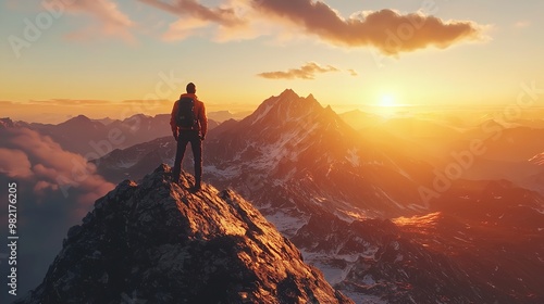 Hiker Standing on Mountain Peak at Sunrise.