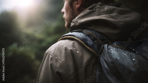 hiker, backpack, jacket, forest, mist, rain, travel, adventure, solitude, person, man, backpacker, trekking, journey, wanderlust, contemplation, nature, wood, tree, wilderness, landscape, green, remote, tranquil, serene, fog, atmosphere, sunlight, light, gear, equipment, outerwear, waterproof, wet, droplet, texture, clothes, strap, shoulder, mood, thoughtful, peace, calm, quiet, mysterious, dramatic