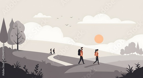 Hikers trek through a serene, stylized landscape under a gentle sun, with rolling hills and distant trees. A peaceful scene of outdoor adventure.