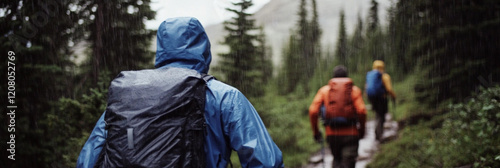 Hikers trekking through a rainy forest trail