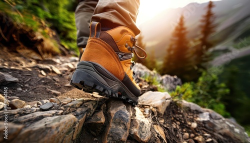 Hiking boots on a rugged trail, adventurous and durable, Adventure, Earth tones, Photograph, Outdoor gear