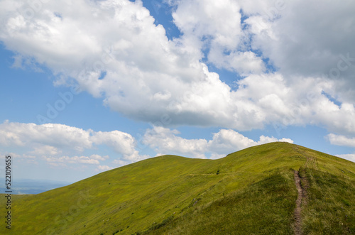 Hiking trail through mountain ridge with green grassy slopes under blue sky with clouds on summer day. Carpathian Mountains, Ukraine