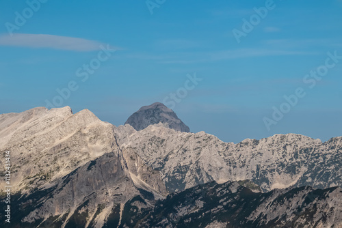 Hiking trail with scenic view of rugged mountain peak Mangart in wild Julian Alps seen from Triglav National Park, Vrsic pass, Slovenia. Wanderlust Slovenian Alps. Sharp steep ridges in alpine terrain